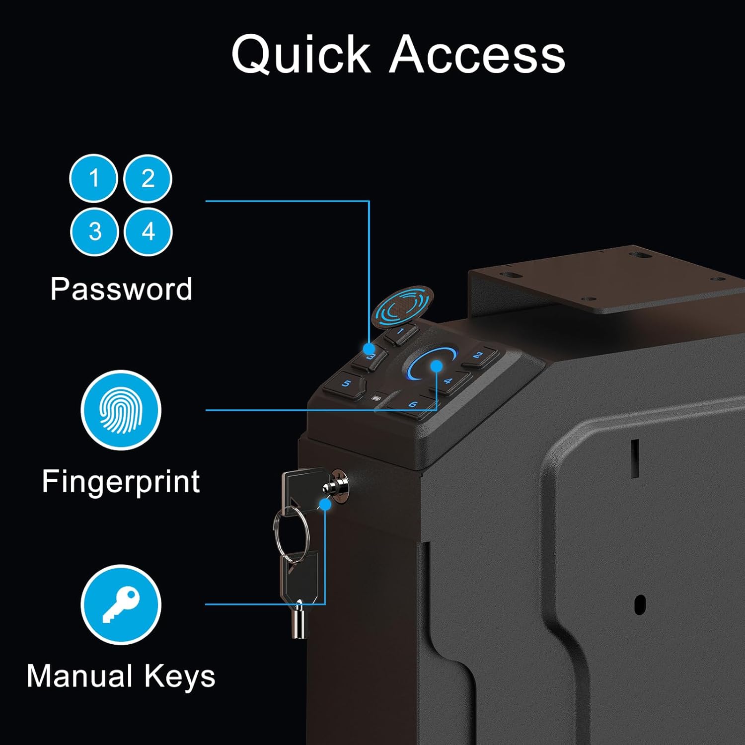 - 【Secure Triple Access Methods】This biometric gun safe for handgun offers three secure unlocking options: advanced fingerprint recognition, a 6-digit digital keypad, and a mechanical backup key—perfect for quick firearm access in emergencies. The high-resolution 508 DPI fingerprint sensor ensures that only authorized users can open the hand gun safe, making it ideal for home defense or as a car gun safe.