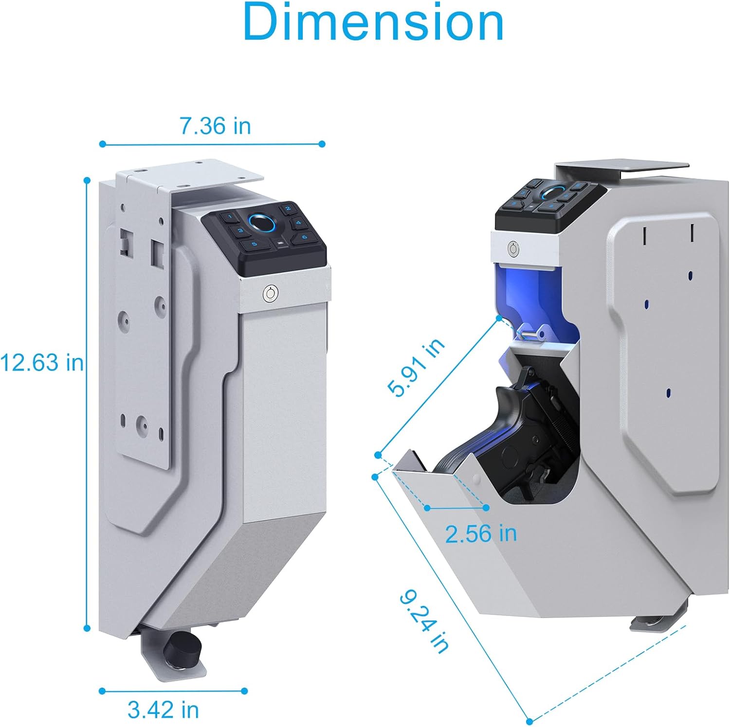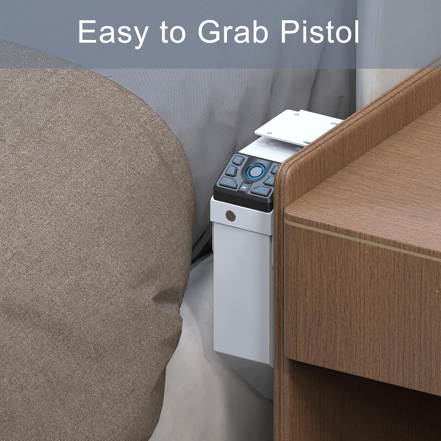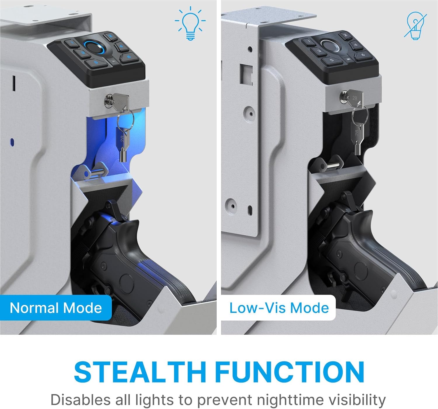 - 【Low-Vis Mode & Concealed Setup】Perfect for discreet environments, this biometric bedside gun safe can be easily mounted under a desk, inside a closet, or beside a nightstand. Activate Low-Vis Mode to turn off keypad and interior lights for stealthy nighttime operation—making it an ideal gun lock box for quick yet hidden access.